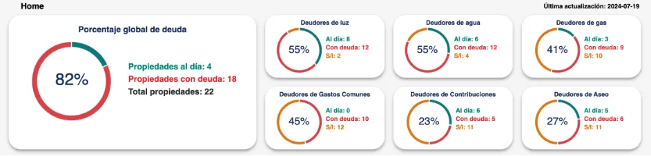 Los gráficos circulares contienen toda esta información de forma resumida. El gráfico de porcentaje global de deuda muestra el total de deudas según el total de propiedades, y los gráficos posteriores, el total de las deudas según el servicio con el que cuenten.