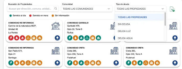 Más abajo, contamos con una opción de filtros que permite realizar descargas de tarjetas con el estado actual de deuda de propiedades específicas. Cada tarjeta tiene un ícono distintivo que diferencia entre casas y departamentos. Los colores de los íconos de los servicios indican el estado de cada deuda. Por ejemplo, el ícono con signos muestra que la propiedad presenta morosidad en los servicios de luz y agua, no tiene deudas de gas y corresponde a un departamento.