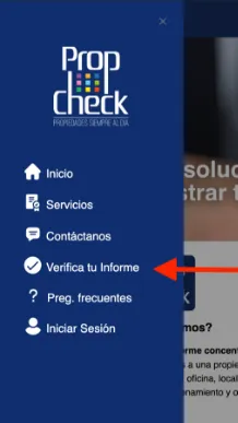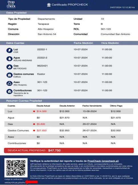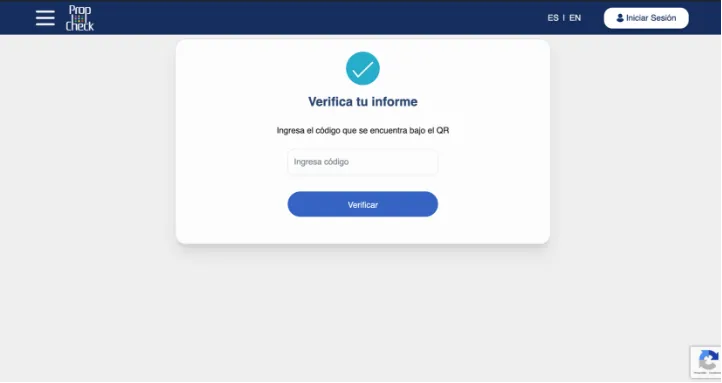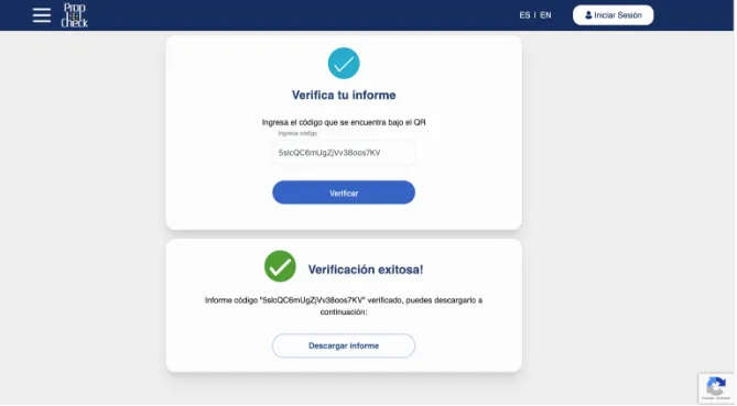 Aquí podrás verificar el código del informe el cuál te mostrará una pestaña que el código es correcto o un cuadro de verificación fallida, lo que significará que el informe no es original de PropCheck.
