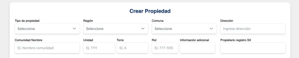 e ingresar los campos solicitados (para tipo de propiedad, región, comuna y dirección existe una lista desplegable)