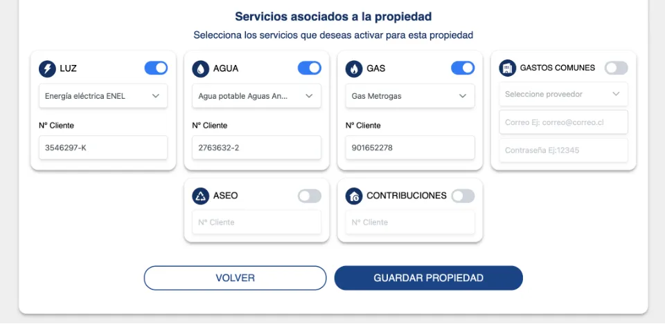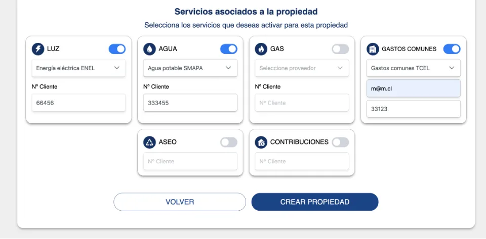 Una vez ingresados seleccionamos los servicios asociados a la propiedad y damos click en guardar propiedad.