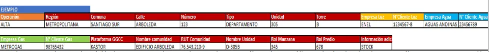 - Empresa gas y número de cliente: Indicar nombre de empresa y número de cliente del servicio. (Por ejemplo: Metrogas, 569XXX.)